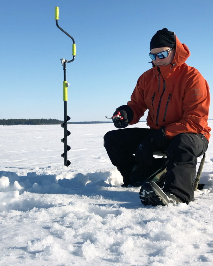 Det finns flera typer av isborrar. Här använder fiskaren en handdriven.